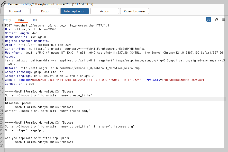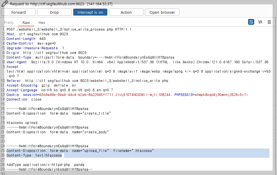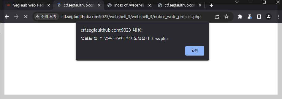 2) 웹셸은 업로드하려고 하면 특정 확장자 파일을 식별하여 업로드가 제한되는 것을 확인할 수 있습니다. 몇 번의 테스트를 통해서 요청을 변조할 시에 content-type이 아닌 파일이름을 기준으로 필터링하는 것을 확인했습니다. php와 phtml이 블랙리스트 방식으로 필터링되었습니다.
