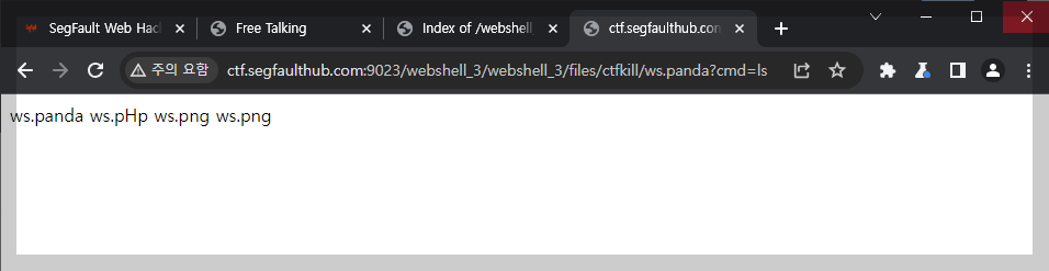 4-1) ws.panda로 접근하여 ls 명령어를 입력하고 웹셸이 작동하는지 확인합니다. 아래 화면과 같이 잘 작동하는 것을 확인할 수 있습니다. 이제 플래그를 획득하면 됩니다.